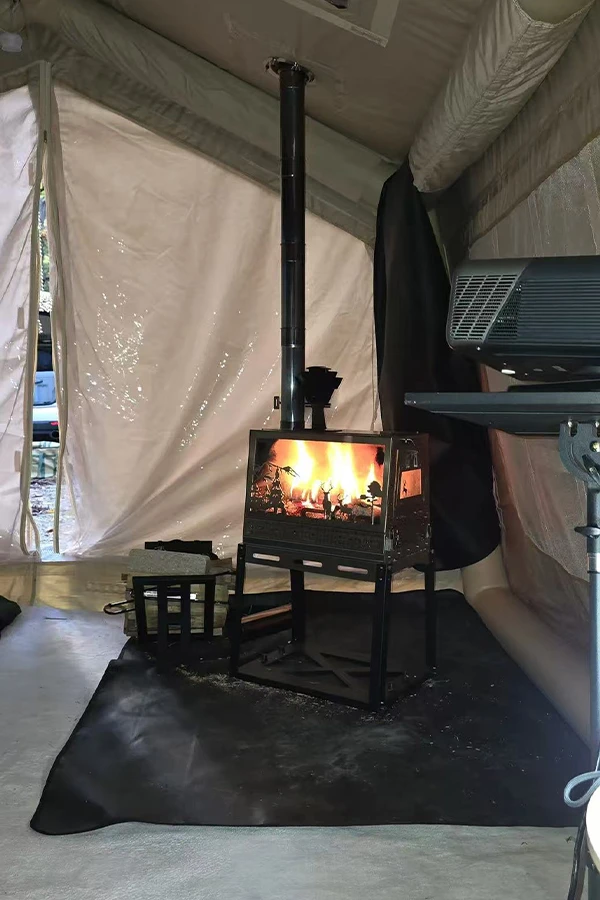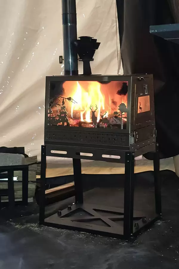 In dieser Szene perfekt in Szene gesetzt, liefert der Ofen kraftvolle Wärme und besticht gleichzeitig durch seine elegante Ästhetik – die lasergeschnittene Wildtier-Silhouette erzeugt eine faszinierende Waldatmosphäre, während die Flammen hinter dem Glas tanzen. Ob Sie einen ruhigen Abend unter dem Sternenhimmel genießen oder mit Freunden Geschichten austauschen, dieser tragbare und dennoch robuste Holzofen spendet zuverlässige Wärme und stimmungsvolles Licht.